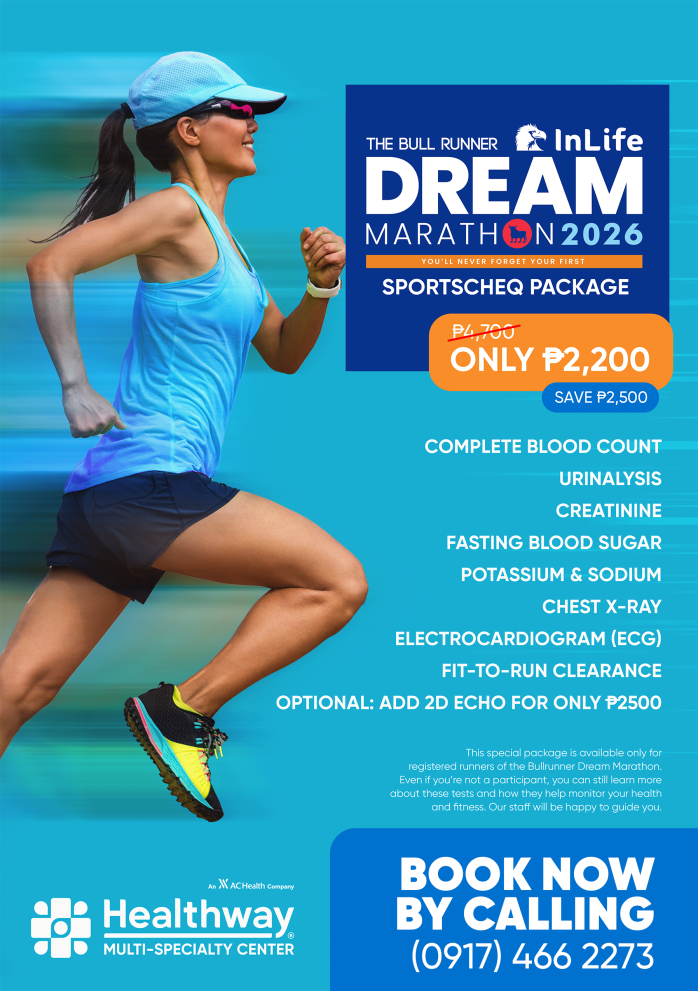 Healthway Medical Network offers the Sportscheq package, special discounted package to obtain the Medical Certificate, exclusively for registered participants. To avail of the package below, call the Healthway Branch of your choice and set an appointment. Inform them that you are a registered participant of TBR InLife Dream Marathon 2026. The package will be available Oct. 15 onwards.